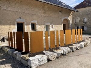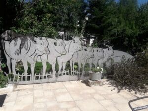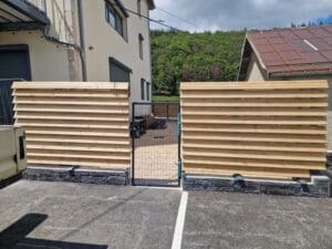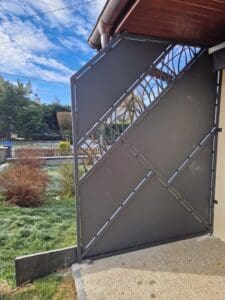 Pour cloturer votre espace, elle peut être très ouverte ou au contraire occultante, pour protéger vos enfants et petits-enfants, vos animaux des dangers de la route ou de la rue. Il conviendra de vérifier en mairie la hauteur autorisée . De conception très moderne ou de style ancien, tout est permis dans les limites des règlements d’urbanisme.